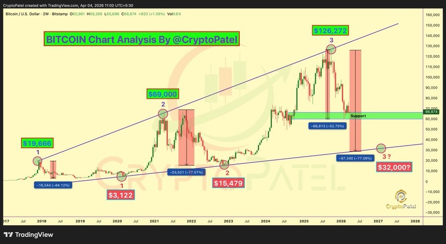 The analyst went back in time and identified patterns in BTC price where the price crashed first before a bullish leg started. In 2018, the price crashed from around $19,000 to $3,122. The same trend happened again in 2022, when the price dropped from $69,000 to $15,479.