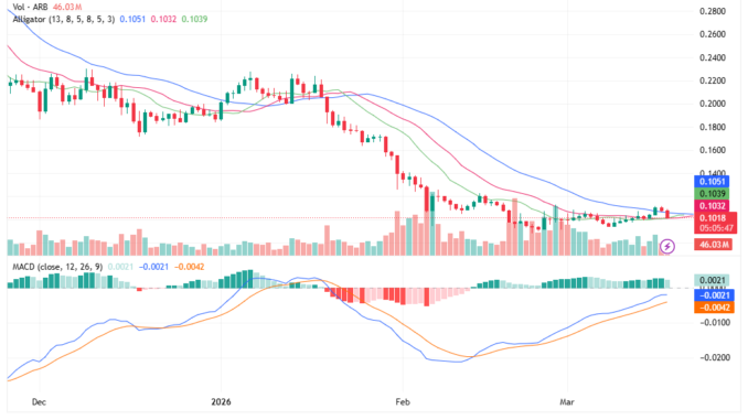 ARB has support at $0.094 and trades below all major SMA and EMA levels, signaling poor performance. The MACD histogram confirms positive market momentum, while the alligator trendlines show that its volatility is dropping. Resistance is at $0.22.