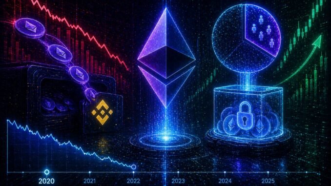 The ETH 2.0 staking rate has reached 31.4% — an all-time high. In practical terms, 38.31 million ETH is now locked in staking contracts, the largest amount ever committed to the network’s validator infrastructure. That record coincides with a separate but related development: circulating Ethereum supply on Binance has fallen to its lowest level since 2020. The exchange that processes the largest share of global ETH trading has less of the asset available than at any point in the past five years.