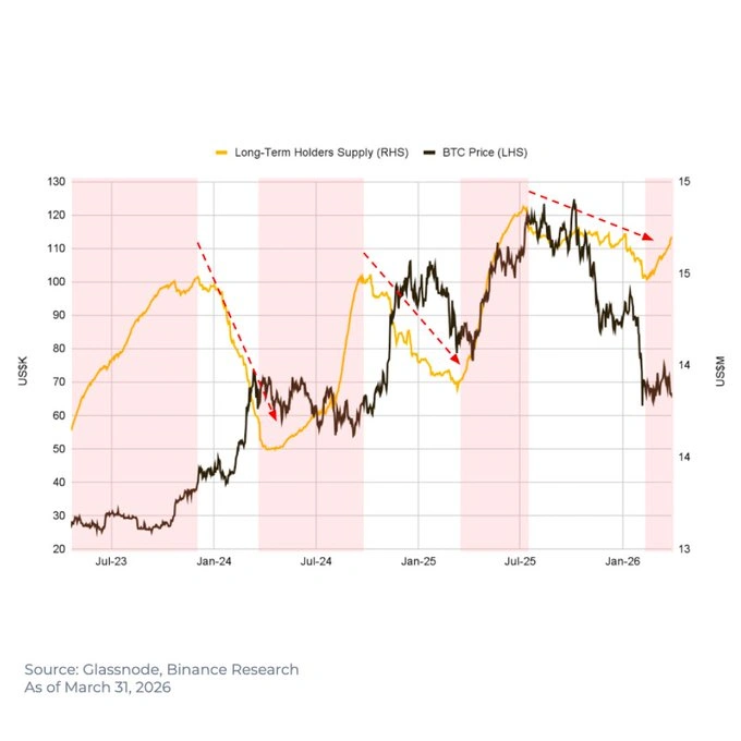Richard Teng, CEO of Binance, shared a simple chart. Two lines. One tracks Bitcoin (BTC) price. The other tracks long-term holder supply. Together, they reveal a pattern that has played out across cycles.
