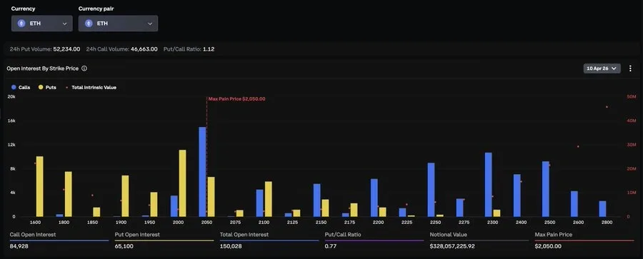 The event primarily consists of BTC which has $1.9 billion in options that are about to expire. The second position belongs to Ethereum which has a market value of $328 million. The gap between them shows the location of current focus.