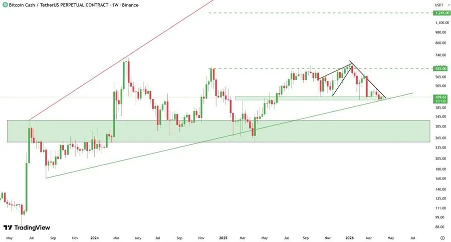Crypto analyst Marcus Corvinus highlighted that BCH is sitting at a key weekly support range between $400 and $420. He noted that the price is holding an ascending trendline. This area acts as a major decision point.