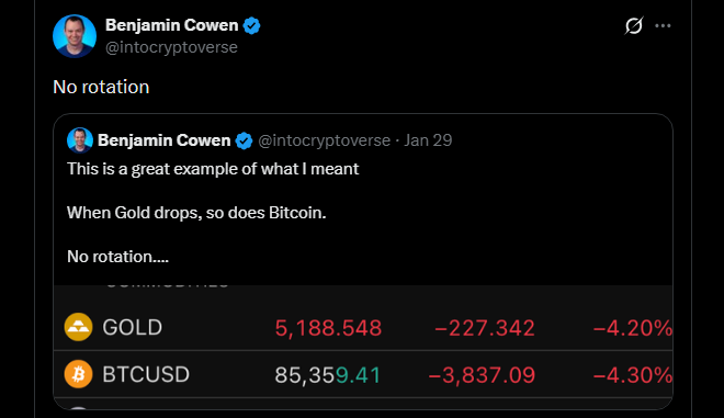 Benjamin Cowen, CEO of Into The Cryptoverse, says no. He has held that view since at least late January, when gold was still riding high and crypto bulls were counting on a rotation trade. He didn’t buy it then. He still doesn’t.
