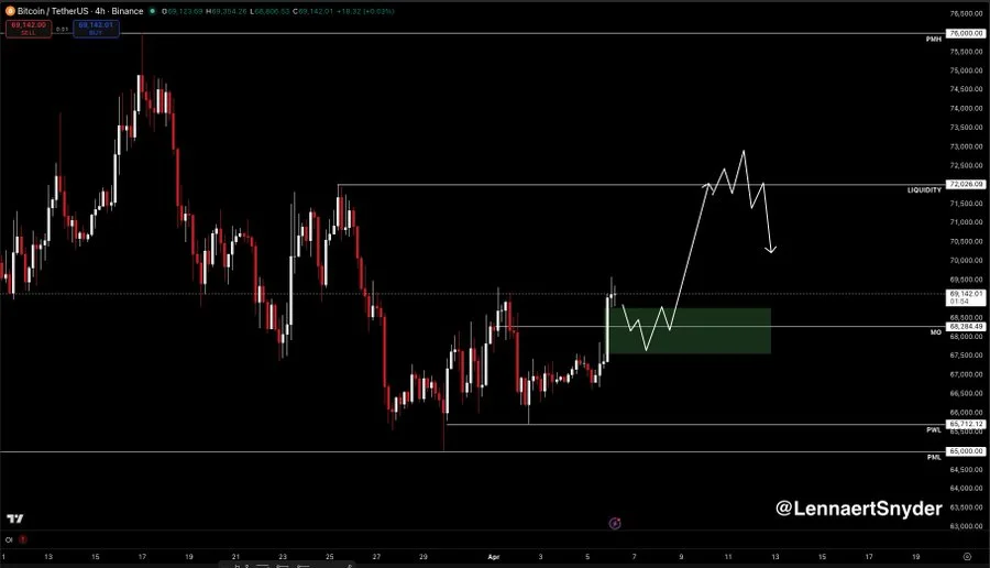 According to Snyder, another imbalance region exists in the $68,280 region. A test of this area can be seen as a buying opportunity after confirmation. The short-term objective is seen in the vicinity of the liquidity zone of $72,000.