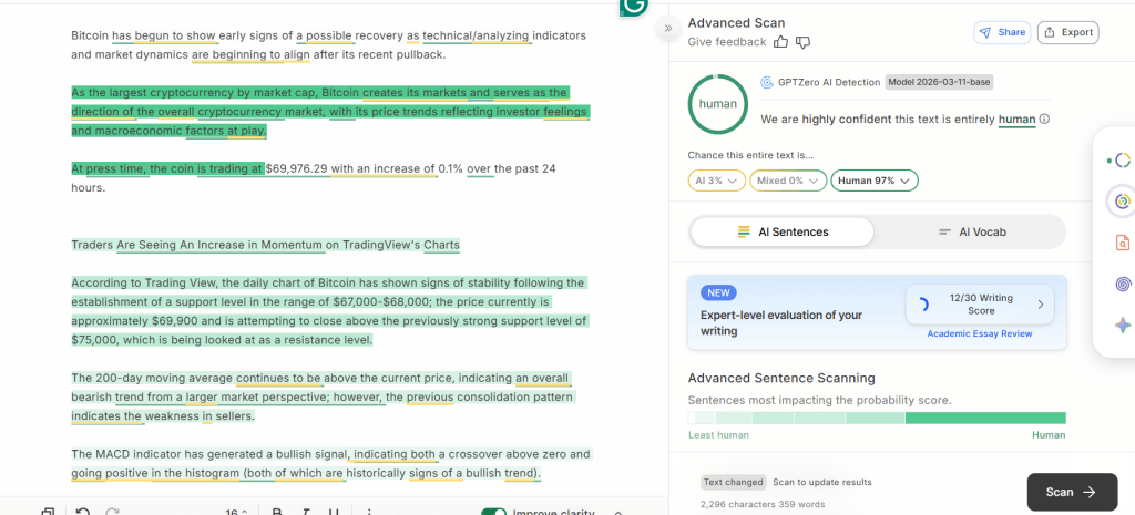 According to Trading View, the daily chart of Bitcoin has shown signs of stability following the establishment of a support level in the range of $67,000-$68,000; the price currently is approximately $69,900 and is attempting to move toward the previously strong support level of $75,000, which is being looked at as a resistance level.
