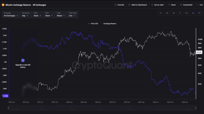 Exchange reserves across all centralized platforms have dropped to approximately 2.75 million BTC as of March 12, according to data from CryptoQuant.