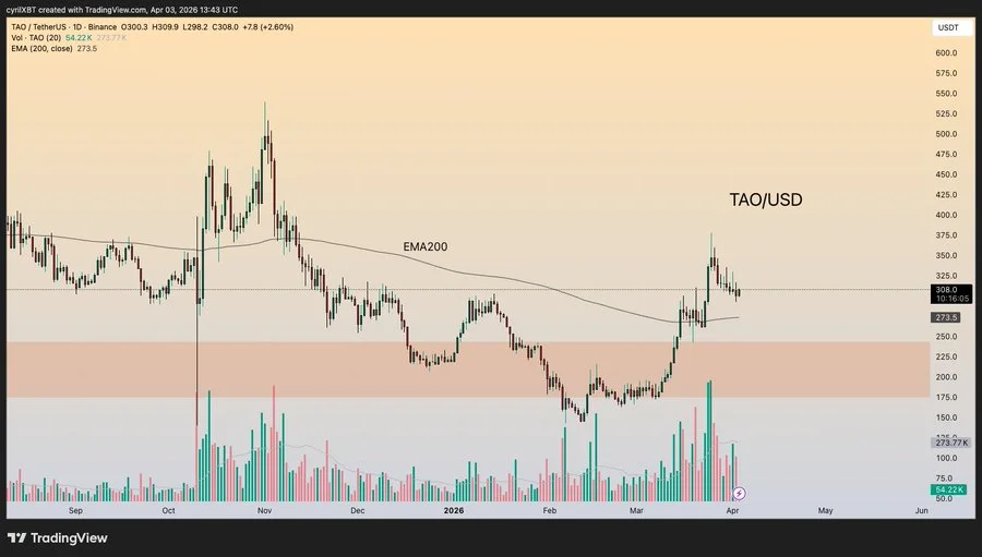 An analyst, CyrilXBT, highlighted that the price structure of TAO is strong compared to other assets. He mentioned that despite a drawdown in the market from $379, there was no damage done to its overall structure. The price is still holding above key support levels.