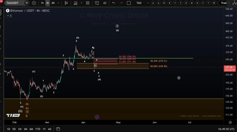 Analyst More Crypto Online highlighted that TAO reached a support zone and showed a reaction. The analyst noted that a break above $297 would confirm a local low. The current structure still leaves room for another downside move.