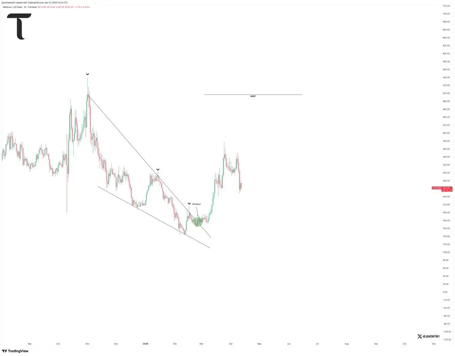 - Falling wedge breakout intact, with analysts targeting a possible move toward $497.