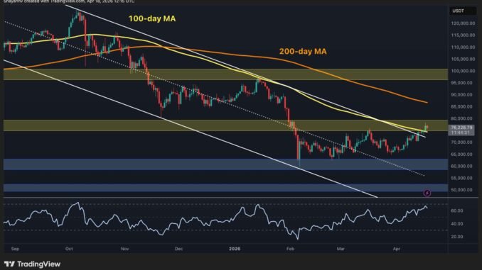 Bitcoin is trading around $76.2k, posting its highest price since the February crash and officially entering the $75k–$80k resistance band that has defined the ceiling of the recent consolidation. The move marks a meaningful escalation in the recovery, with BTC now breaking above the descending channel and the 100-day MA simultaneously, which could be a very optimistic sign if sustained in the coming weeks.