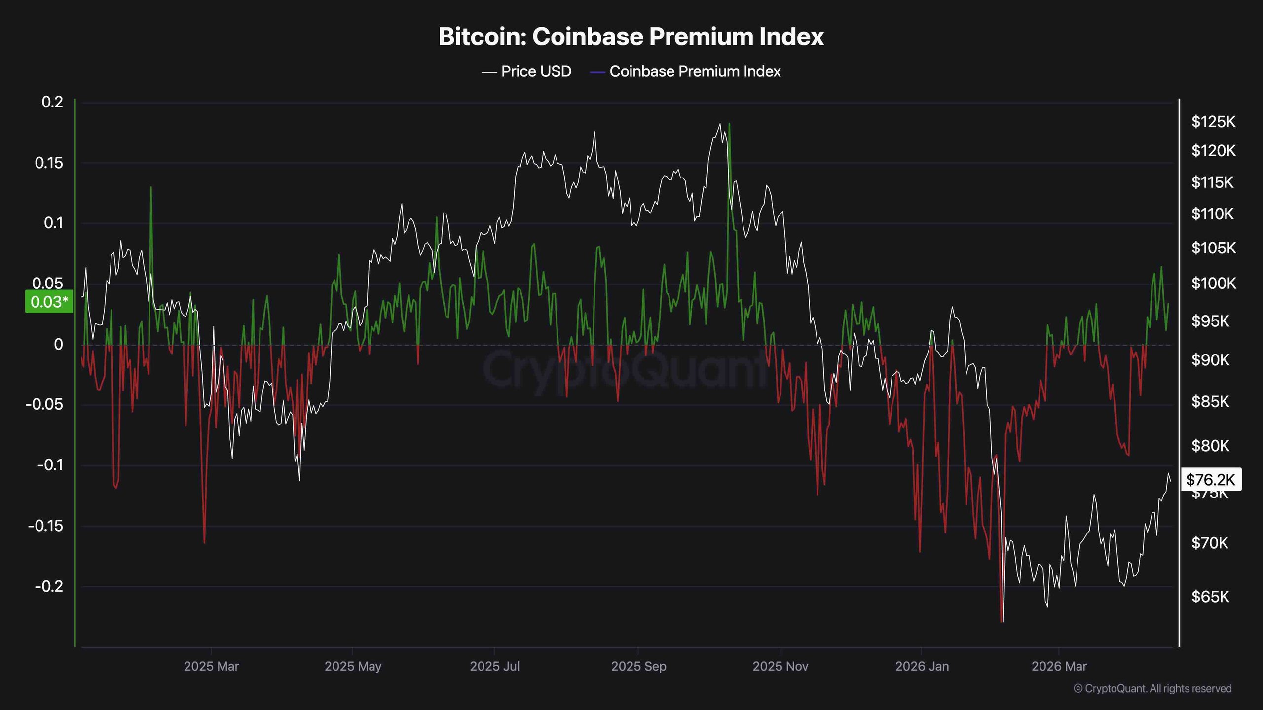 The Bitcoin Coinbase Premium Index has flipped convincingly into positive territory, currently reading around +0.03. This is the first notable positive reading since the correction accelerated in late 2025. After months of deep negative prints that characterized the February crash period, where the index plunged toward -0.20, the shift to green reflects a meaningful change in the behavior of US-based buyers on Coinbase.
