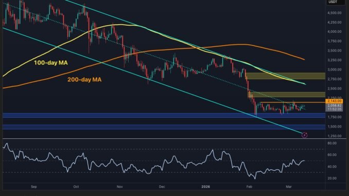 Still, the buyers have one obvious problem: they are not breaking the ceiling. The $2,150 level has repeatedly capped the upside, and until that barrier gives way, the recent advance looks more like controlled consolidation than a fresh impulsive breakout. If that level is reclaimed, ETH could quickly rotate toward the next supply band around $2,300 to $2,400. If not, the market likely remains stuck in a sideways grind above support.