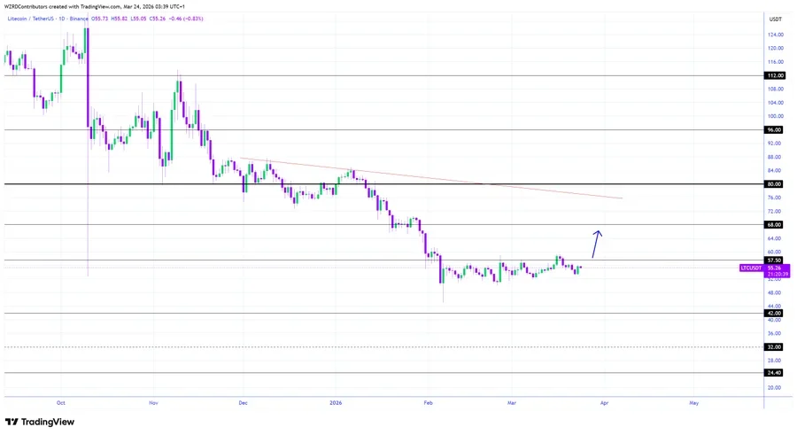 - LTC holds near $56 as weak momentum persists, with volume falling 15% in 24 hours.
