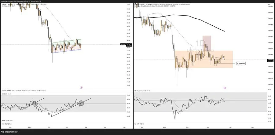 A prominent analyst, Umair Crypto, highlighted that LTC failed to break out on the BTC pair. The pair attempted a move higher but could not hold above the range. It then moved back inside the structure. He said a failed breakout in a downtrend adds bearish weight instead of resetting the chart.