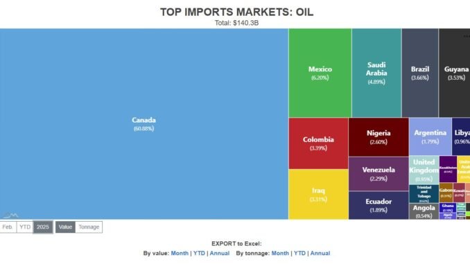 Canada’s domination of U.S. oil imports, topping 60% on an annual basis in 2025, matters for several reasons.