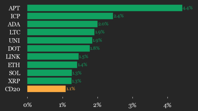CoinDesk 20 performance update: Aptos (APT) gains 4.4% as nearly all assets rise April 30, 2026 CryptoExpert Uncategorized Internet Computer (ICP), up 2.4% from Wednesday, joined Aptos (APT) as a top performer. Source link