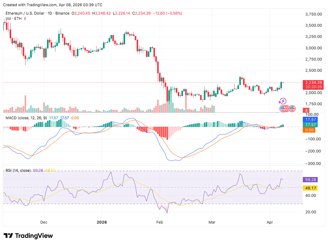 Ethereum and XRP also moved higher as the crypto market stabilized. ETH rose by 6.10% to $2,237.46, with trading volume at $24.4 billion. Its market cap reached $270 billion. The MACD shows convergence at 17.57, while the histogram prints 0.00. This corresponds to a change from bearish to neutral momentum.