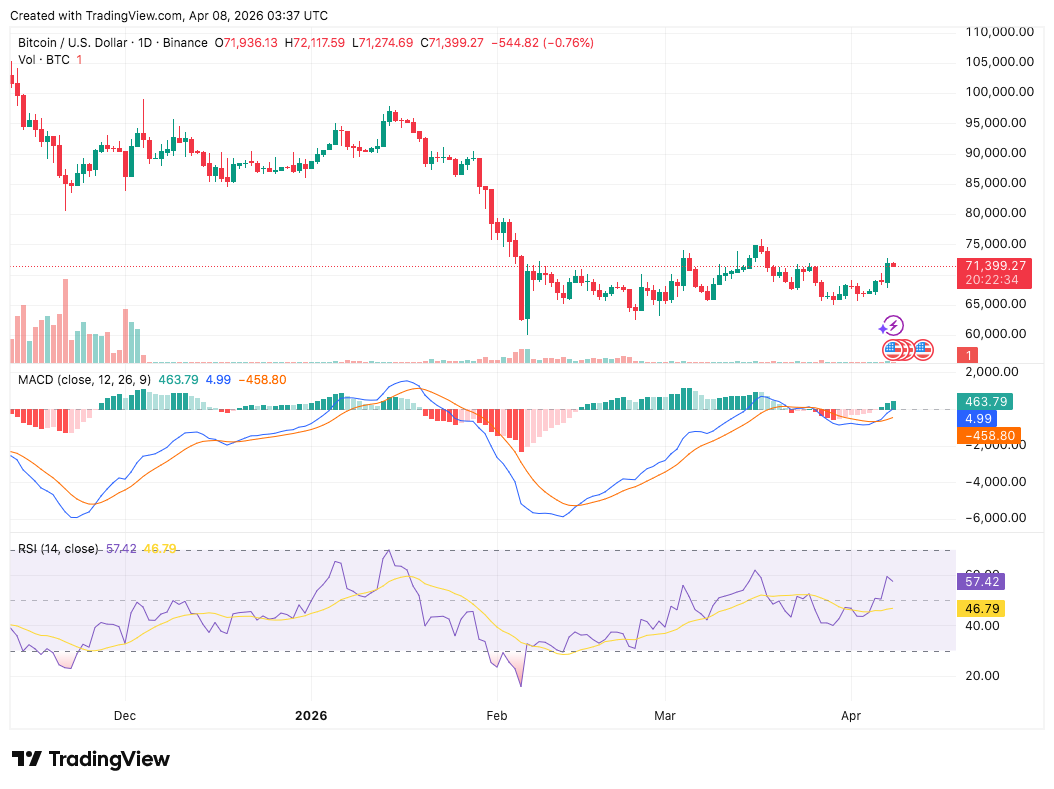 Meanwhile, RSI stands at 57.42, above its 46.79 moving average. This implies an increasing buying strength. The indicator remains below overbought levels, leaving room for further movement. With the momentum, BTC can challenge the resistance, which lies between $73,000 and 75,000. However, a failure to hold the RSI above 55 could push prices toward the $68,000 support level.