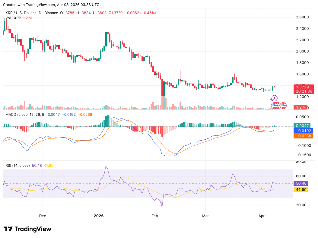 Meanwhile, similar recovery signals are emerging in XRP, although the trend remains less defined. XRP price traded at $1.37, up by 4.05% over the past 24 hours. Its market cap reached $84.1 billion, with trading volume at $2.8 billion. The MACD shows a bullish crossover, with the MACD line at 0.0047 and the signal line at -0.0192. The histogram remains negative at -0.0238 but continues to contract.