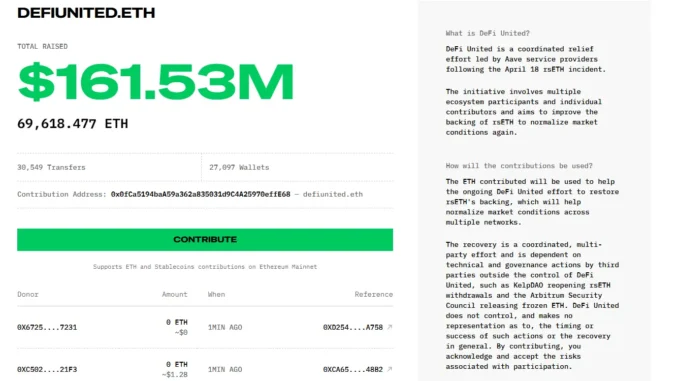 ChainCatcher 消息,由 Aave 服务提供商在 4 月 18 日 rsETH 事件后牵头开展的 DeFi United 协调救援行动,目前已累计筹集 1.6153 亿美元(约 69,618 枚 ETH)。该计划旨在帮助恢复因 Kelp DAO 桥接攻击而受损的 rsETH 抵押品支持,改善多网络市场流动性。 目前主要参与/承诺方包括:Aave 创始人 Stani Kulechov 个人承诺 5,000 ETH;EtherFi 提议贡献 5,000 ETH;Lido Finance 提议贡献最多 2,500 stETH;Golem Foundation 贡献…