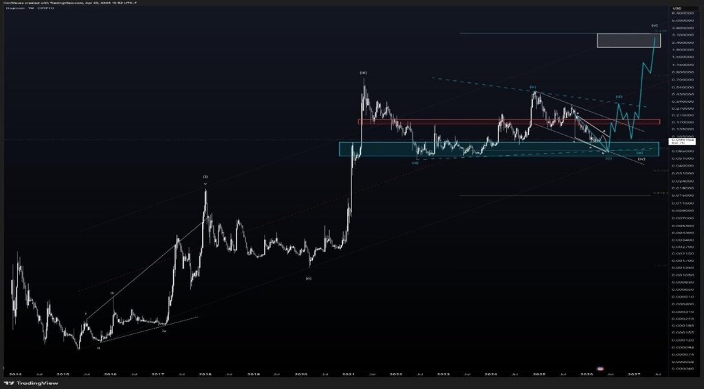His projection outlines multiple price levels that could come into play as the asset builds momentum, suggesting a larger structural move may be developing. While such forecasts remain speculative, they reflect a growing consensus among certain traders that DOGE may be nearing a breakout phase.