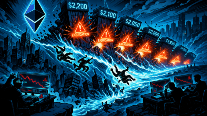 Ethereum trades between liquidation zones, with leverage driving risk of sharp moves above $2,200 or below $2,050.