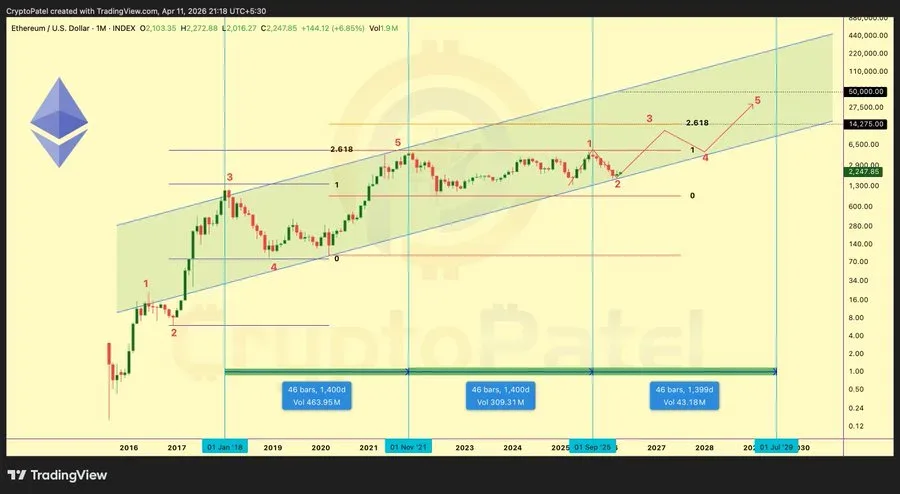 A well-known analyst, Crypto Patel, highlighted a long-term Elliott Wave structure for Ethereum. The first phase, labeled Wave (1), spanned from 2015 to 2021. It completed a five-wave impulse move and reached a peak near $4,800.