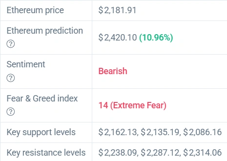 The current Ethereum price (ETH) stands at $2181.91 after it experienced a 3.27% decline during the past 24 hours. The data shows mixed results but the signal remains unchanged. The asset underperforms the overall market while it decreases more than Bitcoin. High levels of fear exist. The forecast indicates upward movement.