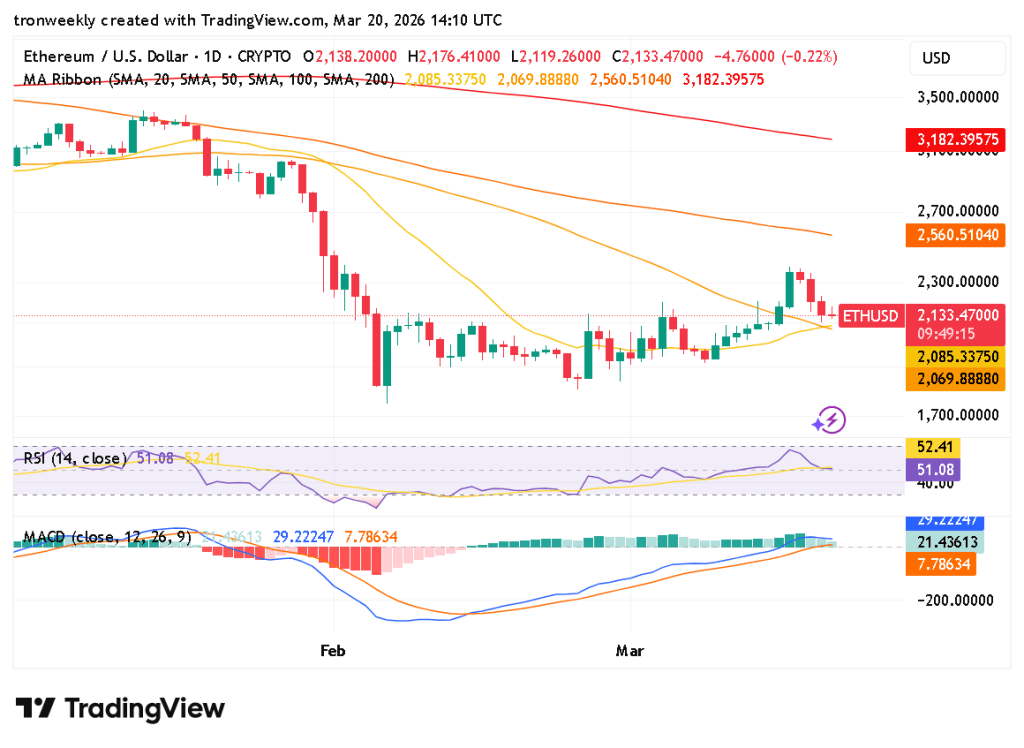On March 20, 2026, a prominent crypto analyst, More Crypto Online, wrote, While it does look like a potential bottom is forming, it is still not entirely confirmed. The rally from yesterday’s low is not very strong, and Ethereum is still battling through $2,157-$2,222.