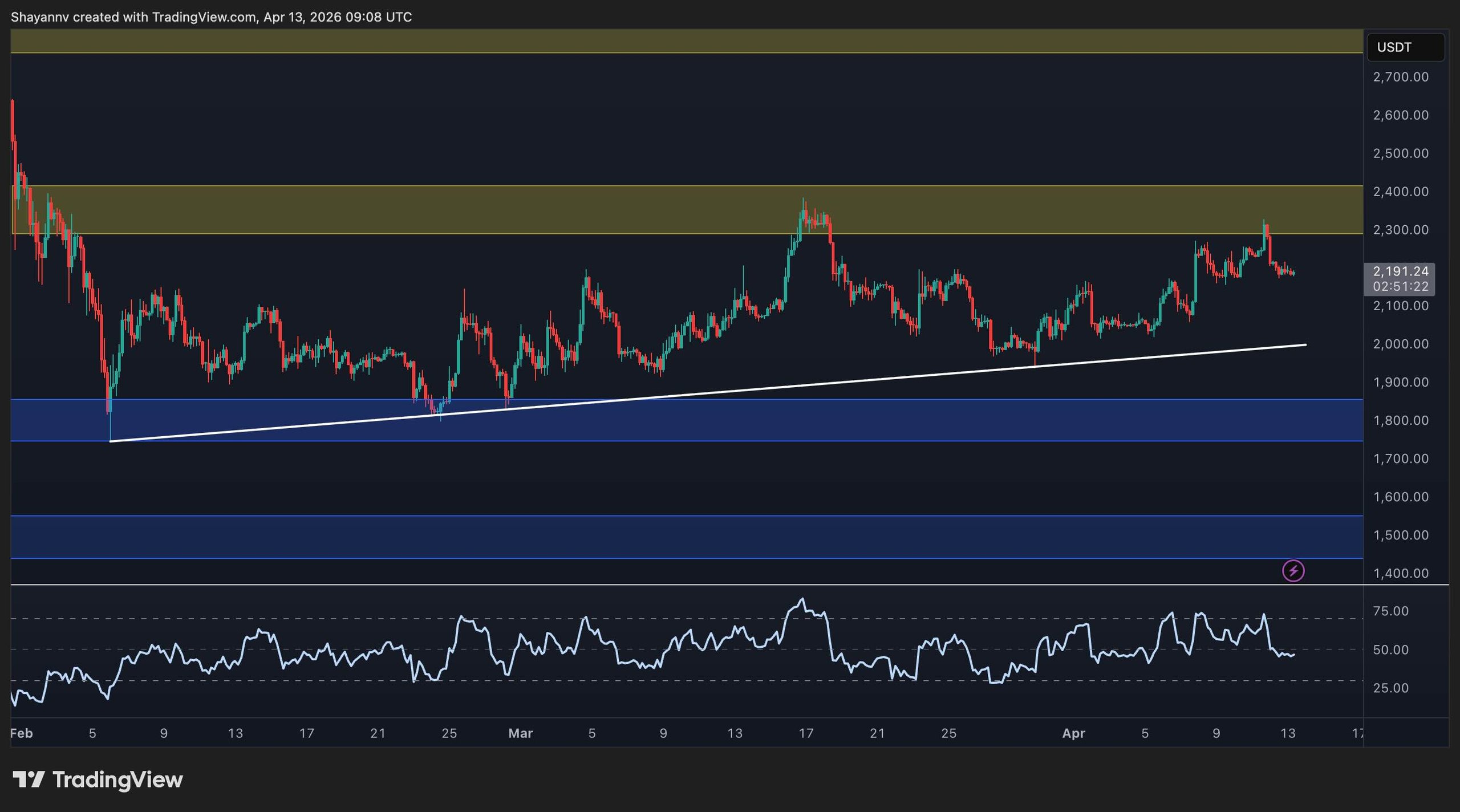 A clean breakout above $2.4k on this timeframe, ideally accompanied by RSI holding above 60, would be the most constructive short-term development ETH has seen in months. But failure to do so keeps the range-bound structure intact and brings the ascending trendline near $2k back into focus as the next test.