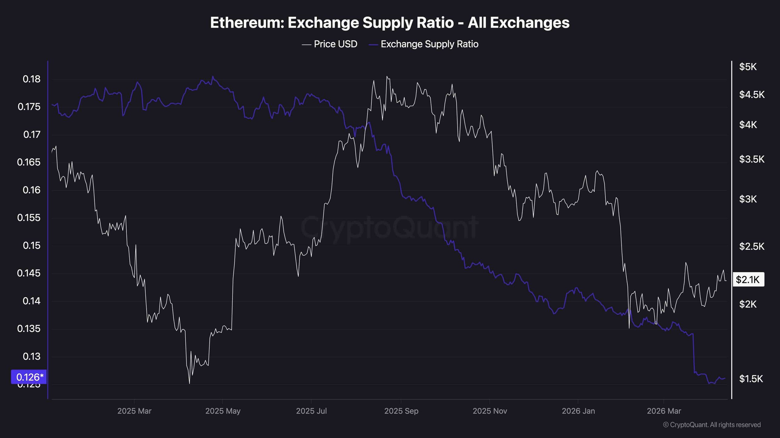 Ethereum’s exchange supply ratio has continued its relentless decline, now sitting at 0.126, which is a multi-year low that reflects an ongoing trend of holders withdrawing ETH from exchanges into self-custody. The drop from the mid-2025 peak near 0.18 has been steep and consistent, mirroring the price correction almost in lockstep.