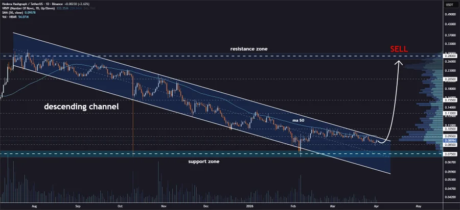 Analyst Jonathan Carter highlighted that the price is developing a breakout pattern, and the HBAR is trading inside a descending channel on the daily chart. The price is also seeing a rejection near the upper end of the channel, but the structure is still intact for a potential breakout.