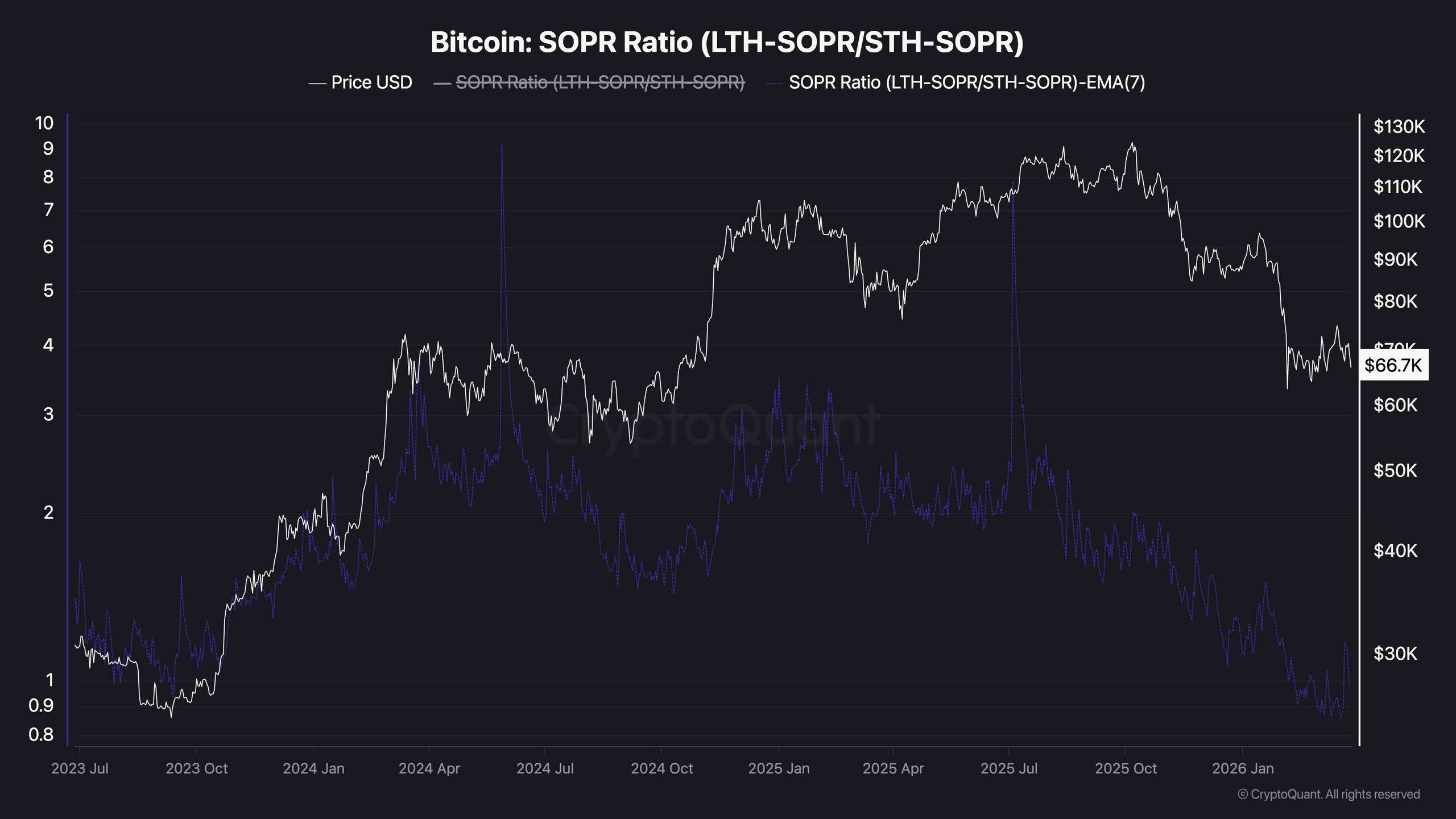 On-chain metrics highlight a key aspect of the current cycle. The LTH-SOPR/STH-SOPR ratio has fallen to levels below one, reaching values comparable to those observed during the accumulation phase at the end of the last market cycle in 2023.