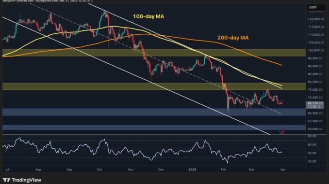 Bitcoin is closing out Q1 2026 on a sour note. The largest crypto is trading around $66.4k after a quarter that saw shedding nearly half its value from the October 2025 peak near $125k. With macro and geopolitical uncertainty still weighing on risk assets and no major structural level reclaimed, BTC heads into Q2 without a clear bullish catalyst on the horizon.