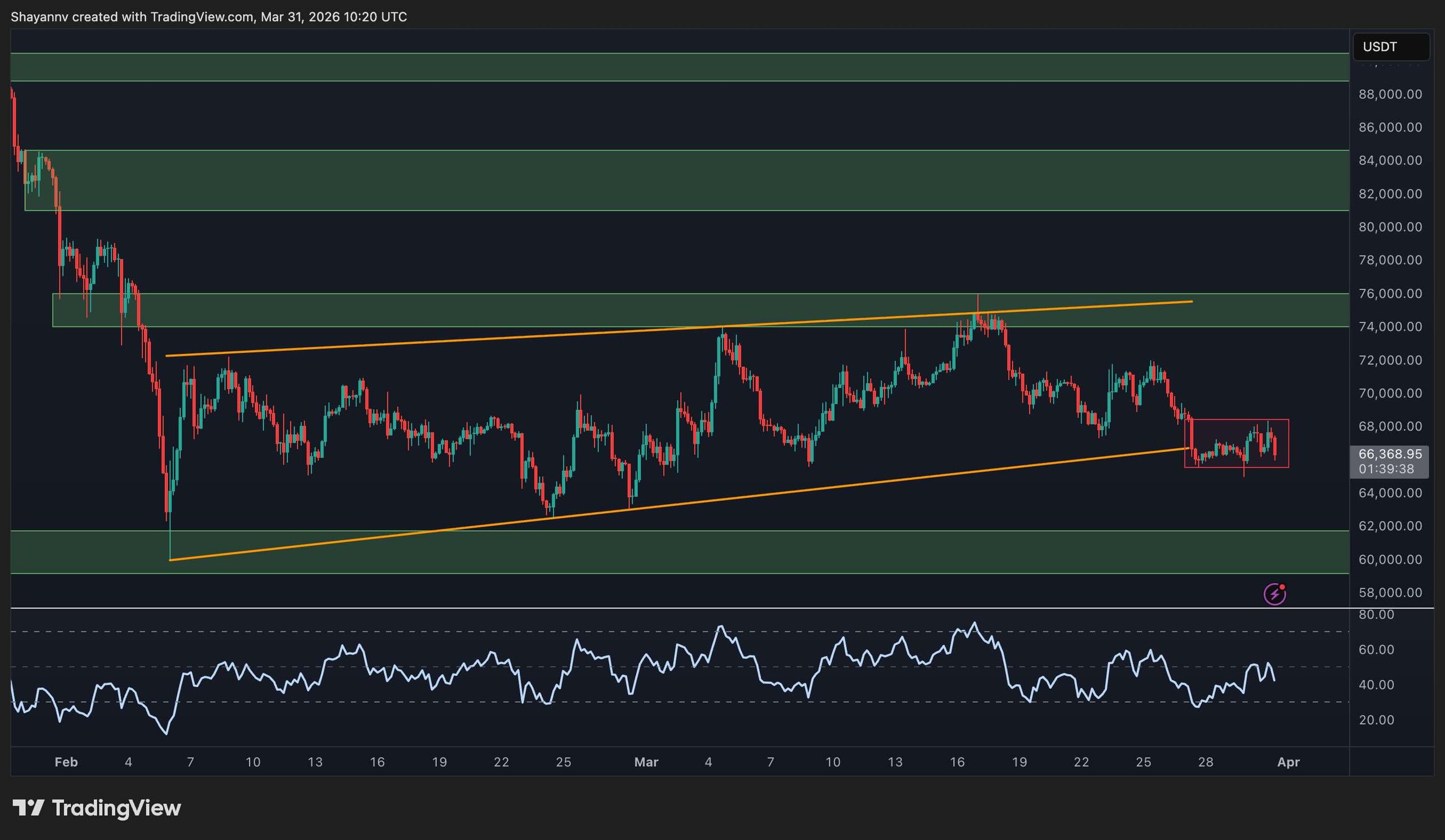 After spending several weeks compressing inside a rising flag pattern between roughly $60k and $75k, BTC has broken the pattern to the downside and is now consolidating near $66. The current range is flagged clearly by the red box on the chart. The triangle’s lower boundary, which had provided support on multiple retests, gave way in the final days of March, and the price has since struggled to reclaim it.