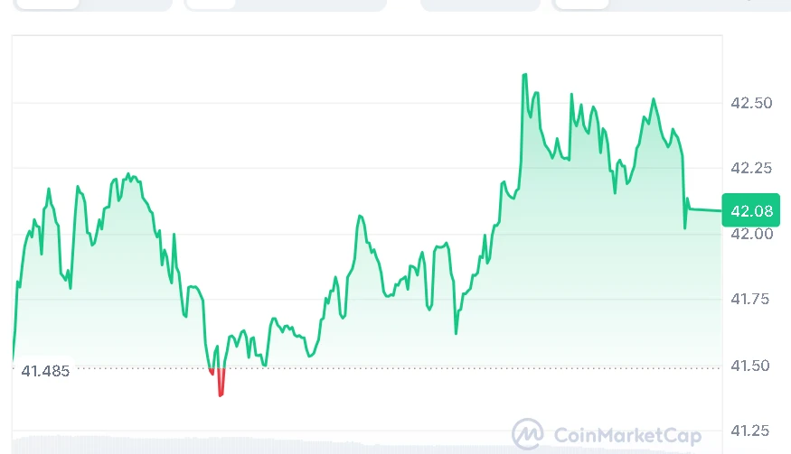 At the time of writing, Hyperliquid (HYPE) is trading at $42.08, showing a 0.17% increase over the last 24 hours. The token has recorded a 24-hour trading volume of $468.85 million, while its total market capitalization stands at $10.77 billion.