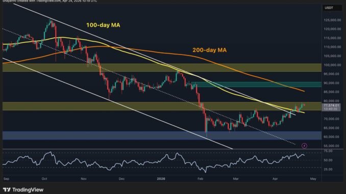 The descending channel that defined Bitcoin’s structure from October 2025 through early April is now firmly behind the price. The cryptocurrency has broken above it, cleared the 100-day moving average (~$74k), and is holding within the $75k–$80k resistance band, with the RSI trending higher around 60.