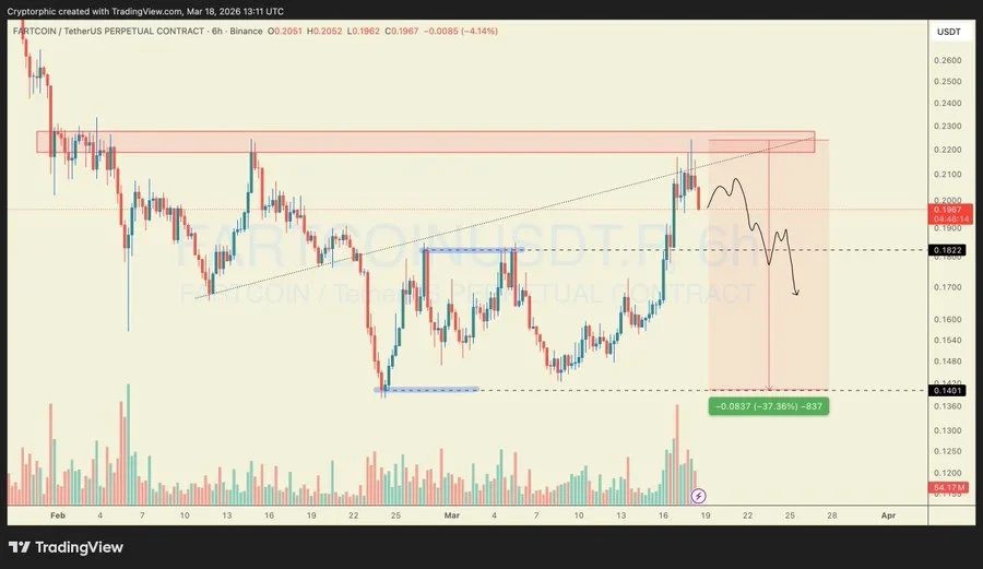 Analyst Cryptorphic highlighted that FARTCOIN has entered a major resistance area between $0.22 and $0.23. He explained that the strength of the rise in this area is weakening. Rapid upward moves into supply zones often lead to consolidation phases. This pattern has appeared across multiple time frames.