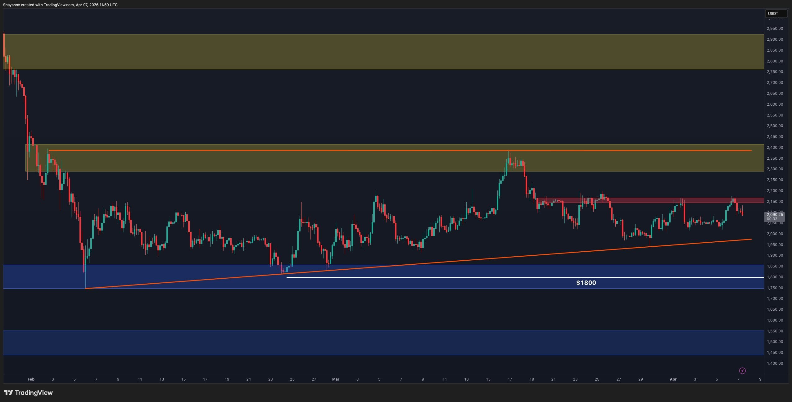 If buyers manage to flip $2.2k into support, the next move would likely target the key  $2.4k supply zone. However, failure to break higher and a loss of the ascending trendline would shift momentum bearish, exposing the $1.8k support area in the coming weeks.