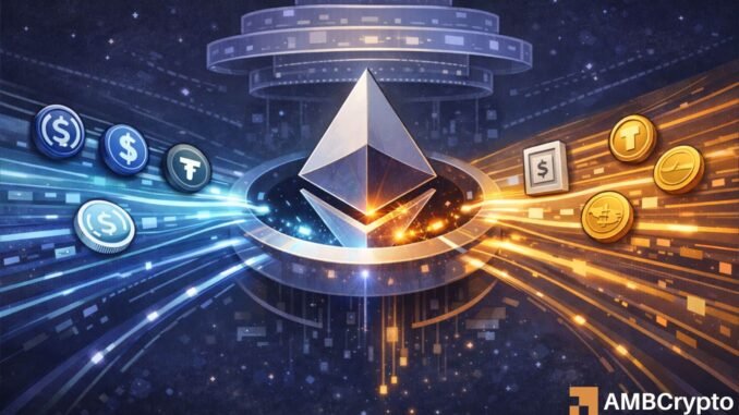 Ethereum’s role shifted as capital moved on-chain for structured financial use rather than speculation. ETH stablecoins held roughly $166.1 billion, showing where liquidity settled.