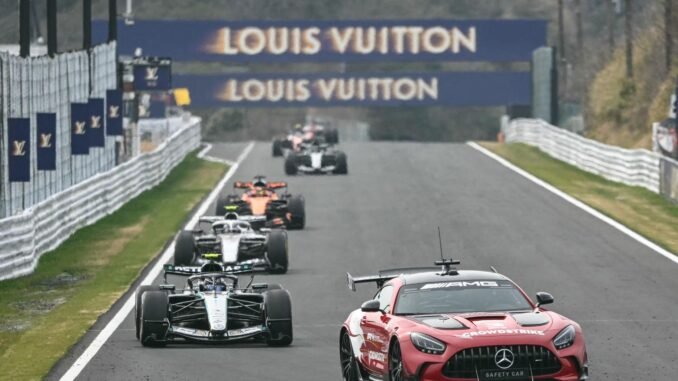 The safety car leads drivers following a crash by Haas F1 Team’s British driver Oliver Bearman during the Formula One Japanese Grand Prix at the Suzuka circuit in Suzuka, Mie prefecture on March 29, 2026. (Photo by Toshifumi KITAMURA / AFP via Getty Images)