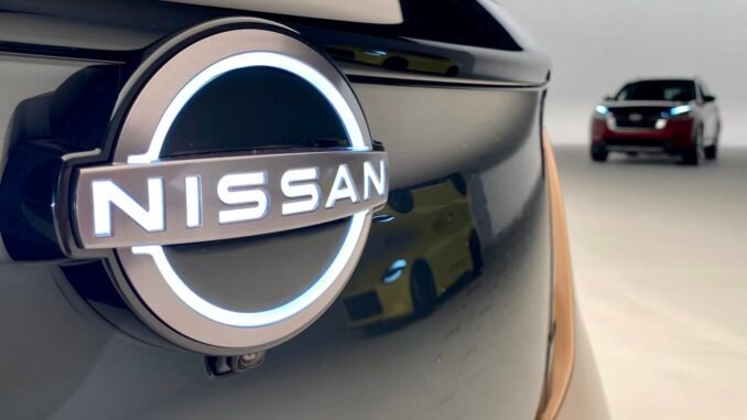 Nissan’s logo is illuminated on a prototype of its new all-electric Ariya crossover. Nissan’s Z Proto performance car is reflected in the vehicle’s grille, while a redesigned Nissan Pathfinder SUV sits in the background.