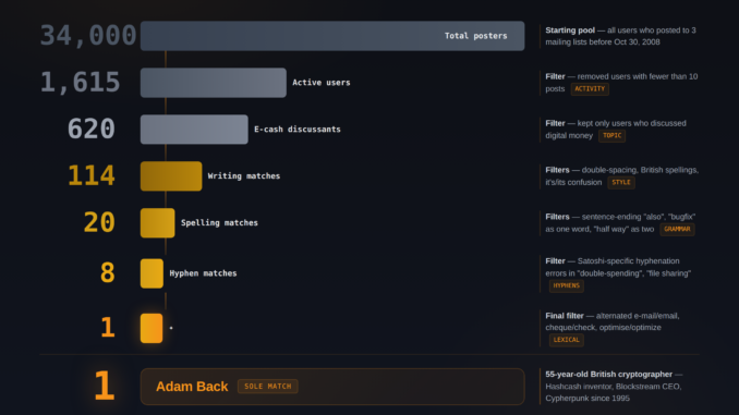 One analysis focused on grammatical quirks. The team identified 325 distinct hyphenation errors in Satoshi’s corpus and found Back shared 67 of them. The second-closest match had 38.