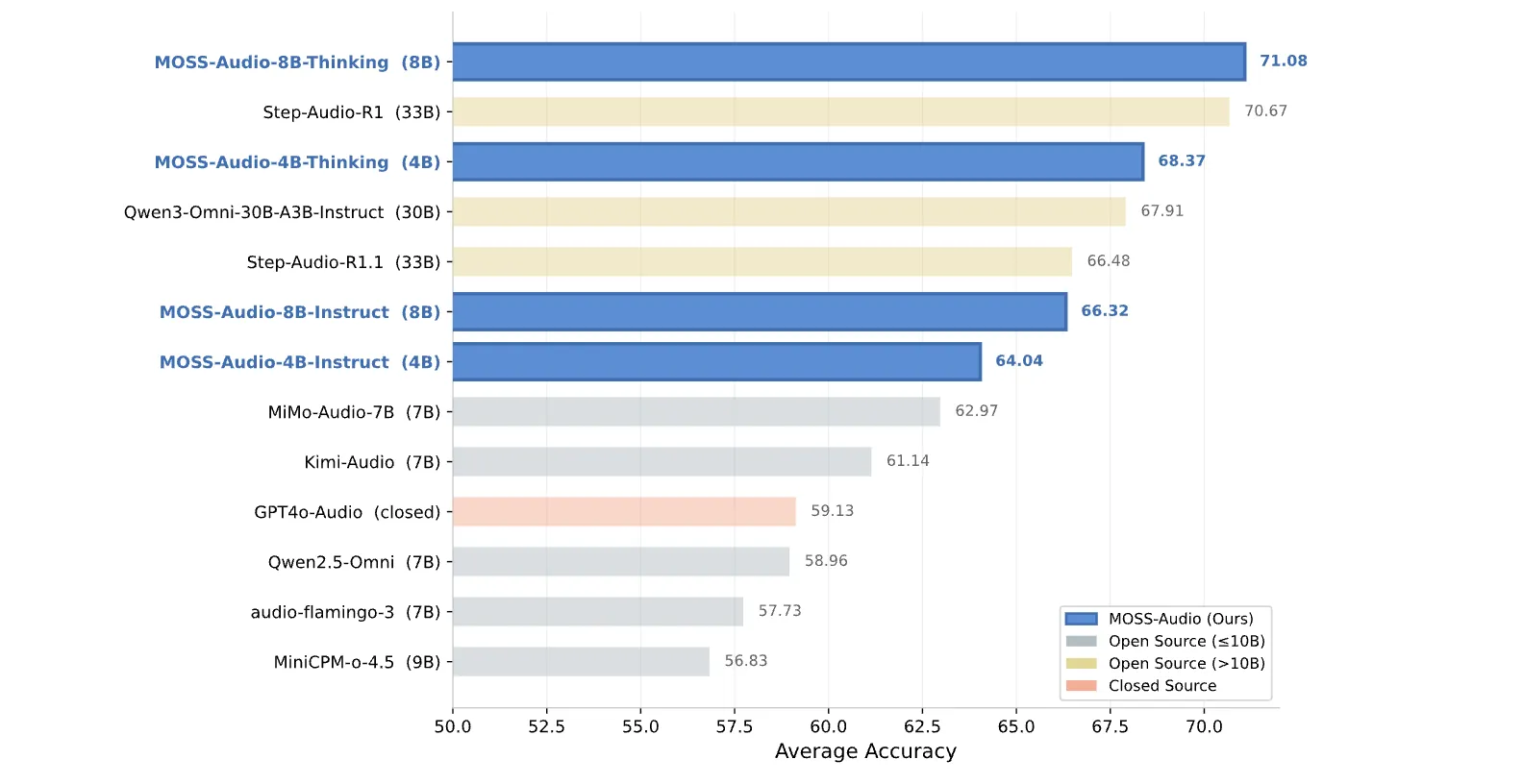 The numbers are strong. On general audio understanding, MOSS-Audio-8B-Thinking achieves an average accuracy of 71.08 across four benchmarks — 77.33 on MMAU, 64.92 on MMAU-Pro, 66.53 on MMAR, and 75.52 on MMSU, outperforming majority of open-source models. That includes larger models: Step-Audio-R1 at 33B scores 70.67, and Qwen3-Omni-30B-A3B-Instruct at 30B scores 67.91. For further context, Kimi-Audio (7B) scores 61.14 and MiMo-Audio-7B scores 62.97 on the same average. The 4B Thinking variant scores 68.37, meaning the smaller model with chain-of-thought training beats all larger open-source instruct-only competitors.