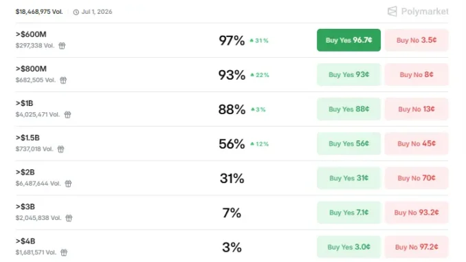 ChainCatcher 消息,Polymarket 最新数据显示,市场对于“MegaETH 上线一天后市值(FDV)超过 10 亿美元”的押注概率目前为 88%,市值超 6 亿美元的概率为 97%,超 8 亿美元的概率为 93%,超 15 亿美元的概率为 56%,超 20 亿美元的概率为 31%。 此前消息称,MegaETH 或将于 4 月 30 日进行 TGE。