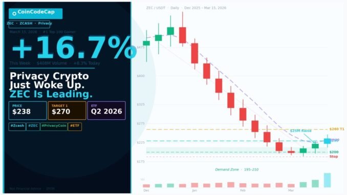 On March 9, the Zcash Open Development Lab announced a $25 million seed raise to continue building the protocol. Price jumped 10% that day. It has not given much of it back. As of March 15, ZEC ($237.20 · Live) is the best-performing asset in the entire crypto top 100 over the past seven days – up 16.7% while Bitcoin gained roughly 2.5%. Volume hit $408 million, a 36% surge. The market is paying attention.
