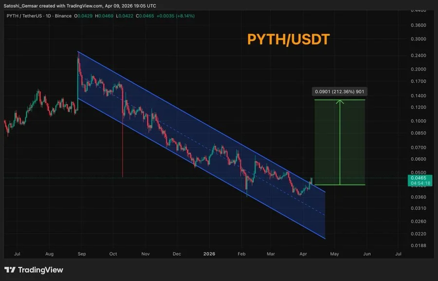 On Saturday, April 11, Pyth Network (PYTH) moved into focus after breaking out of a prolonged descending structure on the daily chart. The shift marked a change in trend direction. Analysts pointed to improving momentum as price action moved beyond a key resistance pattern.