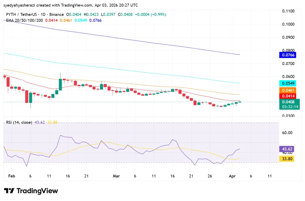 As of writing, Pyth Network (PYTH) price is trading at $0.04095, marking an increase of 3.71% in the past 24 hours. The trading volume is down by 7.3% and is currently standing at $17.87 million. Over the last week, the PYTH price has gone up by 8.62%, according to CoinMarketCap.