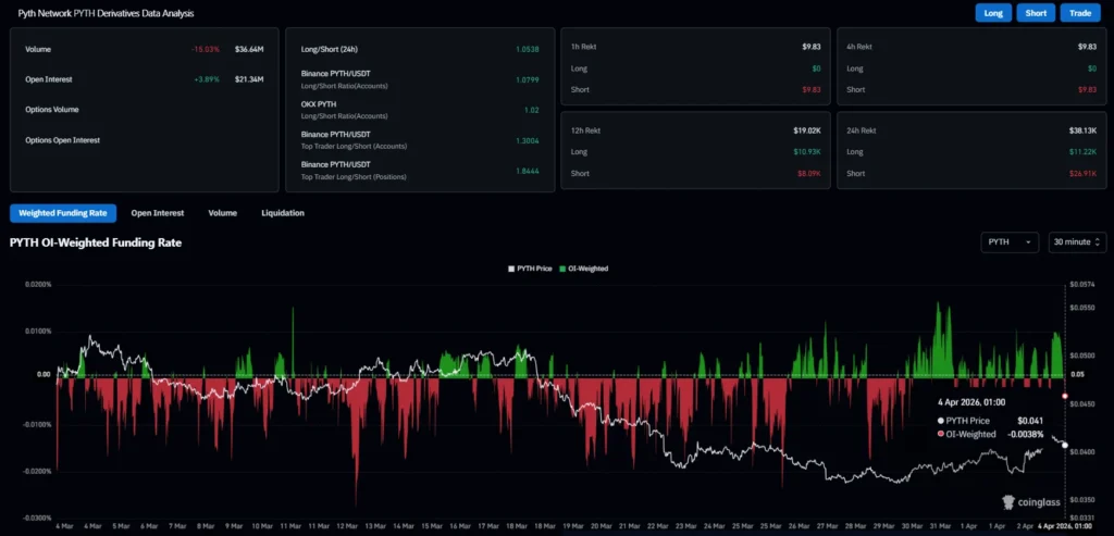 According to CoinGlass data, the future volume has fallen by 15.03% to $36.64 million, but the open interest has grown by 3.89% to $21.34 million. The OI weighted funding rate is at -0.0038%. This indicates that short positions still dominate.