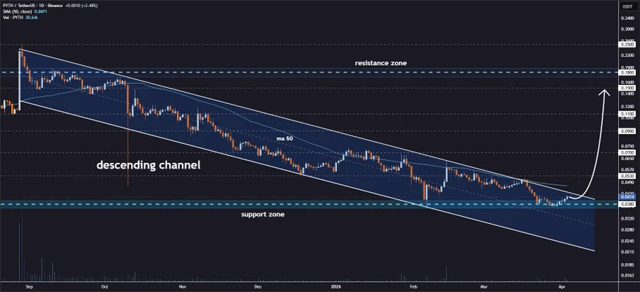 Jonathan Carter, an analyst, highlighted that the PYTH price is approaching a resistance ceiling of a downward channel that has dictated price action for weeks. This level is now behaving like a major resistance area. A confirmed breakout above this structure would also indicate a trend change and invalidate the ongoing bearish formation.